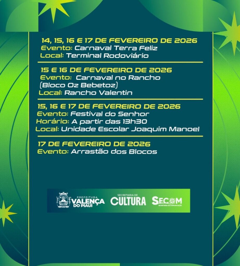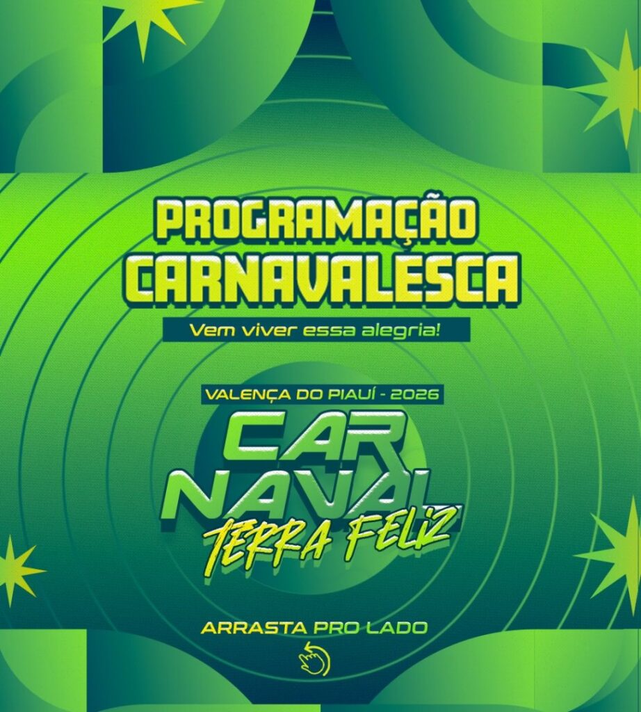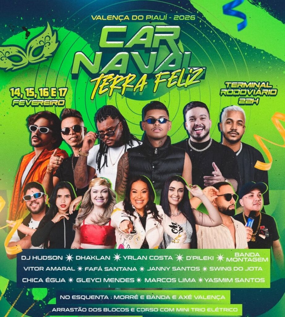 Valença do Piauí já vive a expectativa para o Carnaval Terra Feliz 2026. A Prefeitura Municipal, por meio da Secretaria de Cultura, confirmou a programação oficial e as atrações musicais que irão animar os foliões entre os dias 14 e 17 de fevereiro, no Terminal Rodoviário, sempre a partir das 22h.