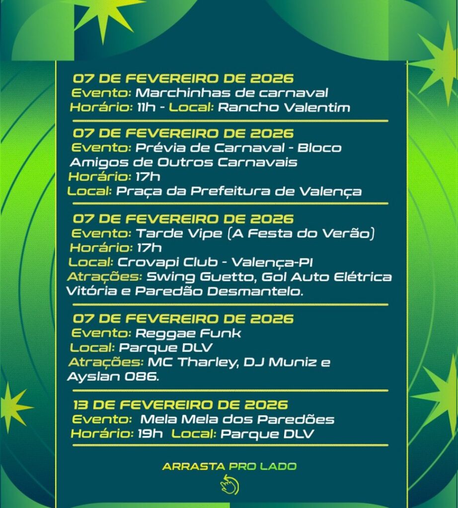 Com expectativa de grande público, o evento deve impulsionar o comércio local e fortalecer o calendário cultural de Valença do Piauí, consolidando a cidade como um dos principais destinos carnavalescos da região.